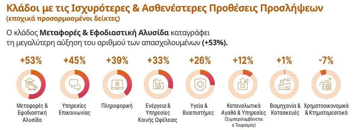 Ο ισχυρότερος ρυθμός προσλήψεων καταγράφεται στον κλάδο των Μεταφορών & της Εφοδιαστικής Αλυσίδας με τις προοπτικές απασχόλησης να φθάνουν στο 53%, σημειώνοντας αύξηση κατά 45% συγκριτικά με το 2ο τρίμηνο και κατά 58% σε σχέση με το αντίστοιχο περσινό.