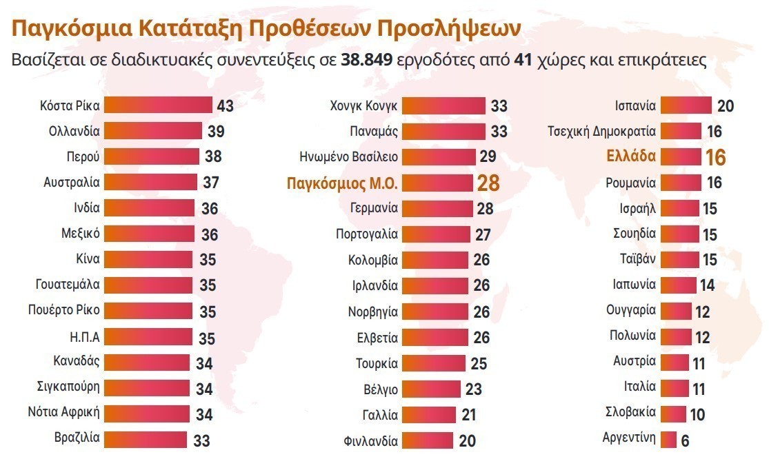 Οι ισχυρότερες προθέσεις προσλήψεων για το 3ο τρίμηνο του 2023 προβλέπονται στην Κόστα Ρίκα (43), την Ολλανδία (39) και το Περού (38).