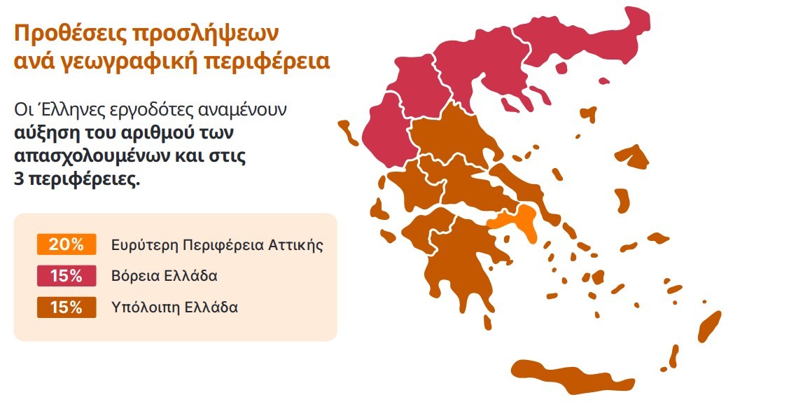 Επιπλέον, το 35% των 510 εργοδοτών που συμμετείχαν στην έρευνα αναμένουν αύξηση προσλήψεων, το 47% δεν αναμένει καμία αλλαγή και το 15% προβλέπει μείωση.