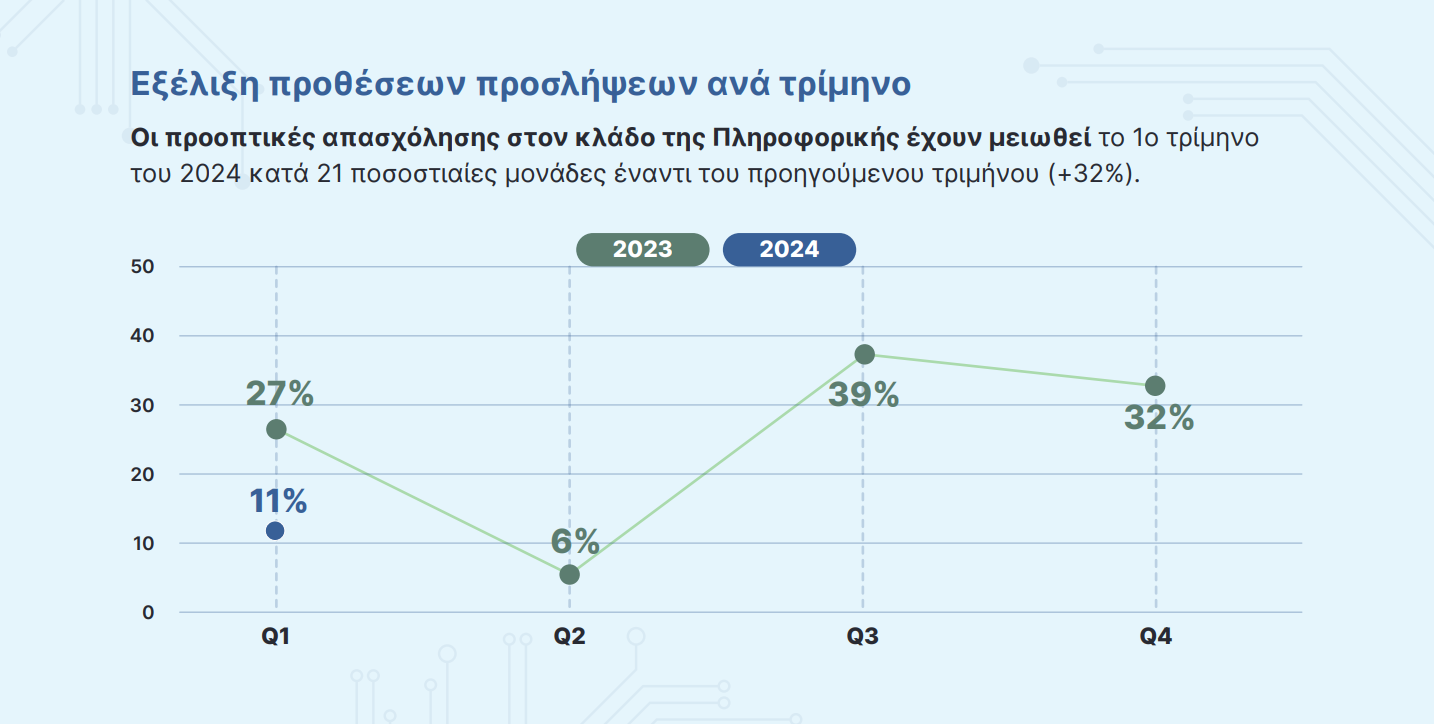 Συγκρατημένες Προθέσεις Προσλήψεων στον κλάδο της Πληροφορικής στην Ελλάδα για το πρώτο τρίμηνο του 2024 αναδεικνύουν τα τελευταία στοιχεία που προέκυψαν στο πλαίσιο της τριμηνιαίας Έρευνας Προοπτικών Απασχόλησης του ομίλου ManpowerGroup. Σύμφωνα με την έρευνα, οι προθέσεις προσλήψεων για τον συγκεκριμένο κλάδο διαμορφώνονται στο +11%.