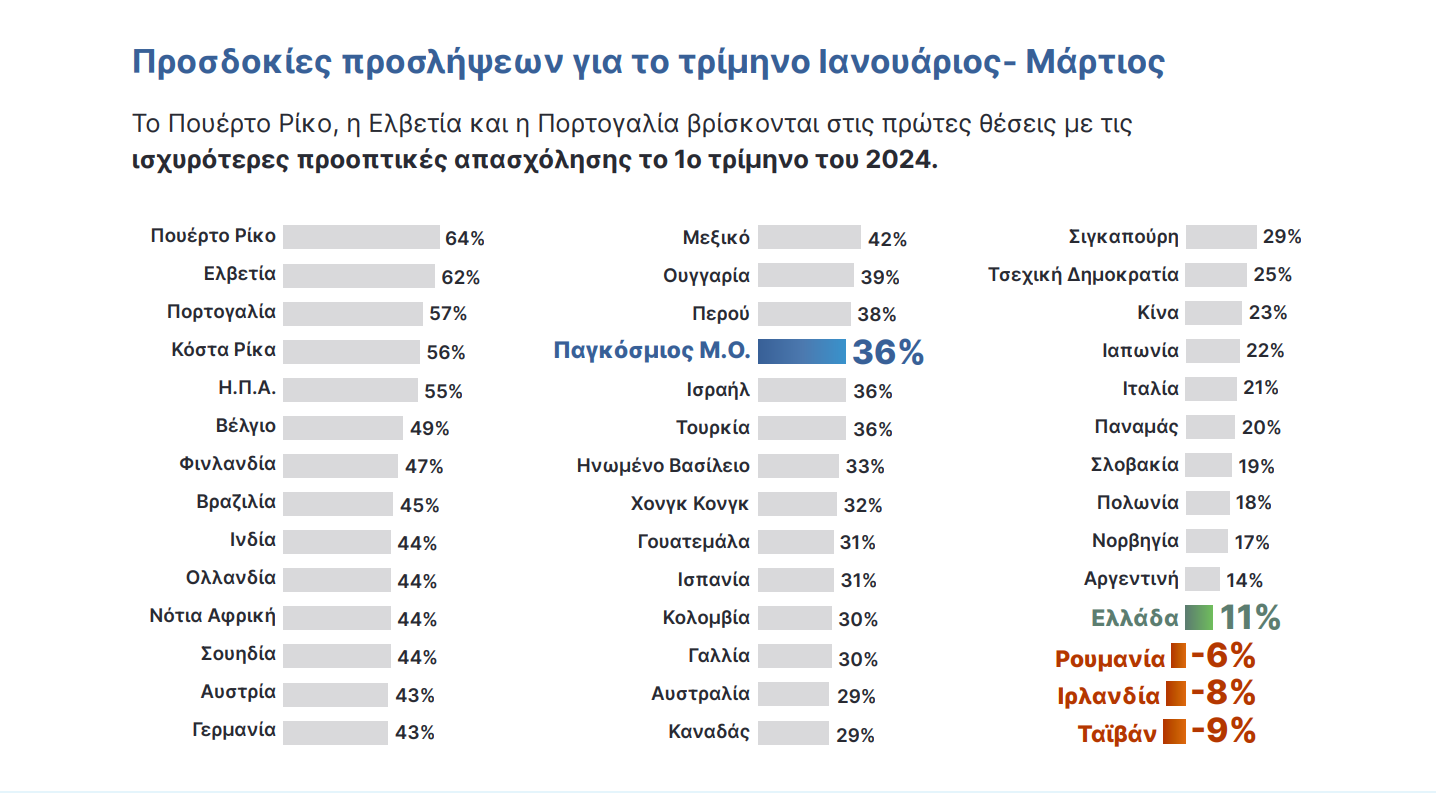 Παρατηρείται ότι οι προοπτικές απασχόλησης στην Ελλάδα για το πρώτο τρίμηνο του 2024 αποτυπώνουν μια σημαντική μείωση σε σχέση με τα προηγούμενα τρίμηνα. Το ποσοστό που ανέφεραν οι Έλληνες εργοδότες, +11%, εμφανίζεται μειωμένο κατά -21% σε σύγκριση με το προηγούμενο τρίμηνο έχοντας παράλληλα μειωθεί κατά -16% σε σχέση με την αντίστοιχη περίοδο του προηγούμενου έτους.