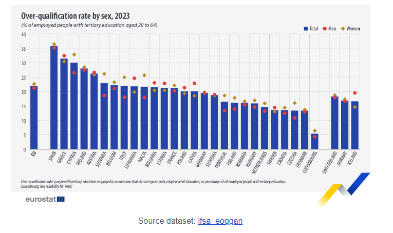 Τα υψηλότερα ποσοστά υπερπροσόντων στην ΕΕ καταγράφονται στην Ισπανία (36%), στην Ελλάδα (31%) και στην Κύπρο (30%), ενώ τα χαμηλότερα ποσοστά καταγράφηκαν στο Λουξεμβούργο (5%), στη Δανία και στην Τσεχία (13%).