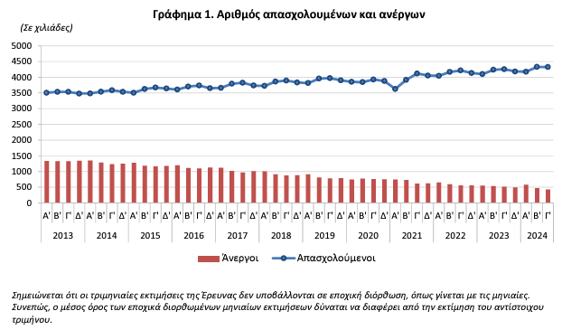 Στο 9% μειώθηκε το ποσοστό της ανεργίας στη χώρα το γ’ τρίμηνο εφέτος, από 10,8% το αντίστοιχο τρίμηνο του προηγούμενου έτους και 9,8% το β’ τρίμηνο του 2024.