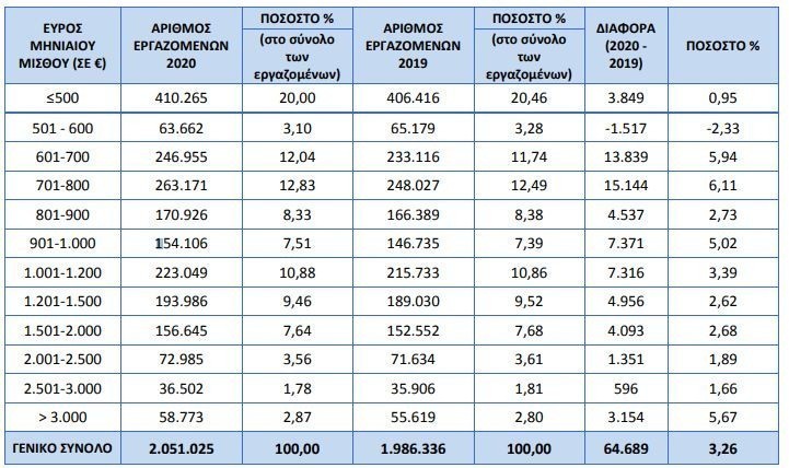 Συγκεκριμένα, όπως προκύπτει κι από τον πίνακα που ακολουθεί κι ο οποίος παραθέτει τον Αριθμό των εργαζομένων ανά εύρος μηναίων αποδοχών, τόσο το 2019 όσο και το 2020, οι μισοί μισθωτοί, δηλαδή πάνω από 984.000 σε σύνολο 2.051.025, εισέπρατταν μισθούς μέχρι 800 ευρώ το μήνα. Περίπου 400.000 την προηγούμενη διετία είχαν μισθούς από 500 ευρώ και κάτω, ενώ πάνω από 1,3 εκατ. εργαζόμενοι του ιδιωτικού τομέα είχαν μισθό μέχρι 1.000 ευρώ μεικτά, ήτοι 700 ευρώ καθαρά (ποσοστό δηλαδή 63,8%).