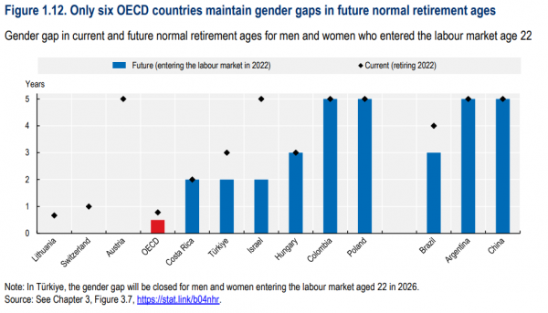 Για τις γυναίκες, τόσο στην Ελλάδα όσο και στις περισσότερες χώρες του ΟΟΣΑ, τα όρια συνταξιοδότησης για τις νέες εργαζόμενες θα είναι τα ίδια με αυτά των ανδρών καθώς μόνο έξι χώρες έχουν χαμηλότερα όρια σε σχέση με αυτά των ανδρών. Η τάση, όπως σημειώνει η έκθεση, είναι να εξισώνονται τα όρια ηλικίας αντρών και γυναικών.