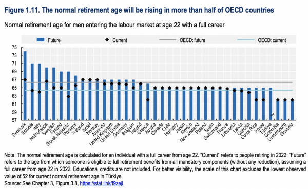 Ο μέσος όρος για τα όρια πλήρους συνταξιοδότησης στον ΟΟΣΑ το 2022 ανερχόταν στα 64,4 χρόνια για τους άντρες, με την Τουρκία να αποτελεί τη μεγάλη εξαίρεση, με το όριο συνταξιοδότησης μόλις στα 52 χρόνια. Για τους άντρες που εισέρχονται σήμερα στην αγορά εργασίας, το μέσο όριο θα αυξηθεί κατά περίπου δύο χρόνια, φτάνοντας στα 66,3 χρόνια.