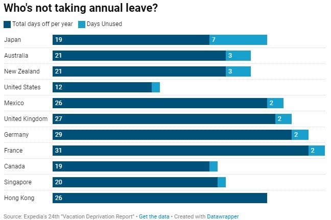 Η έρευνα σε περισσότερους από 11.500 εργαζομένους έδειξε ότι οι Αμερικανοί παίρνουν τον λιγότερο χρόνο άδειας ετησίως (11 ημέρες), ακολουθούμενοι από την Ιαπωνία (12 ημέρες). Ωστόσο, μόνο το 53% των Ιαπώνων δήλωσαν ότι αισθάνονται «στερημένοι από διακοπές» σε σύγκριση με το 65% των Αμερικανών, όπως έδειξε η έρευνα.