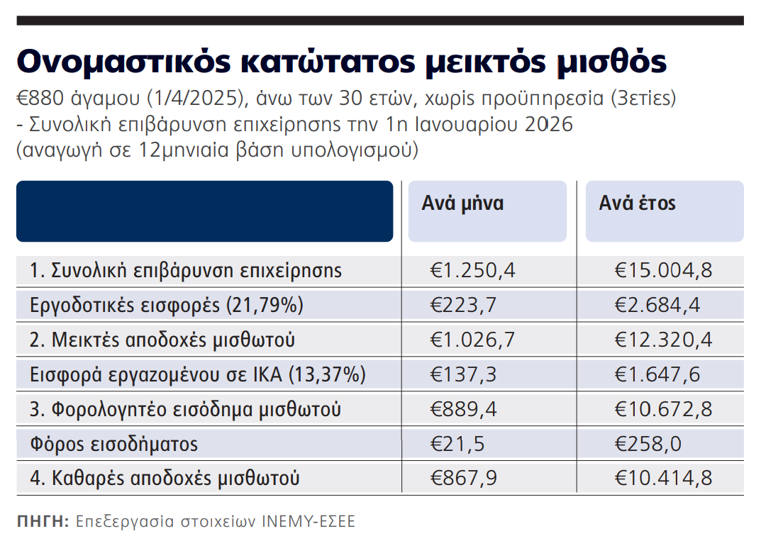 Αναδεικνύοντας το πρόβλημα της επιβάρυνσης των επιχειρήσεων, επισημαίνει ότι ο σημερινός κατώτατος μισθός των 880 ευρώ στην επιχείρηση κοστίζει, κυρίως λόγω των ασφαλιστικών εισφορών, 1.250,4 ευρώ μηνιαίως και 15.004,8 ετησίως, ενώ ο μισθωτός λαμβάνει καθαρά 867,9 ευρώ μηνιαίως και 10.414,8 ευρώ ετησίως.
