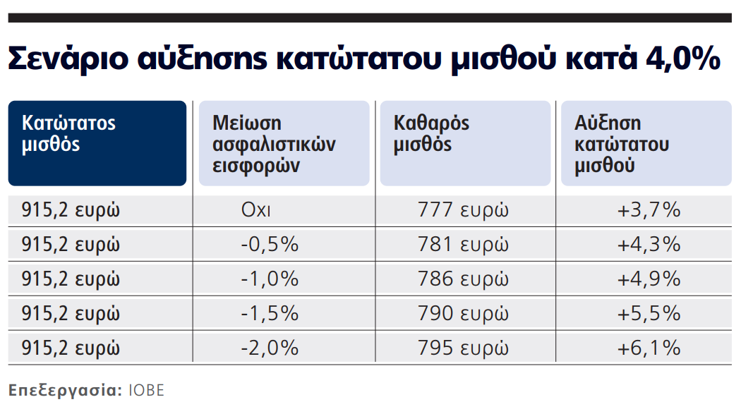 Συγκεκριμένα, αν ο κατώτατος μισθός αυξηθεί κατά 4% και το σύνολο των εισφορών που επιβαρύνουν την επιχείρηση μειωθεί κατά δύο ποσοστιαίες μονάδες, η καθαρή αύξηση για τον μισθωτό θα είναι 6,1%.