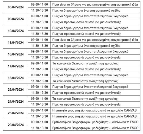 Όσοι αναζητούν ή θέλουν να αλλάξουν εργασία, μπορούν να παρακολουθήσουν εργαστήρια από εξειδικευμένα στελέχη, στις εξής θεματικές ενότητες: