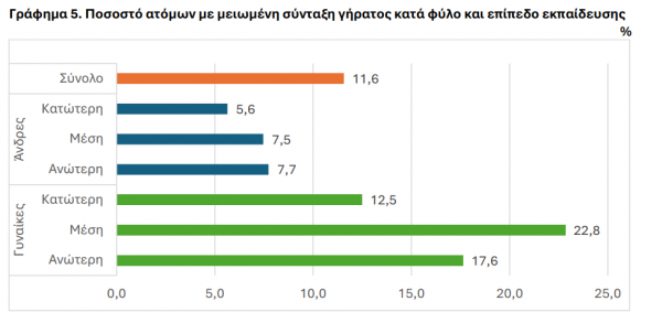 Το ποσοστό των ατόμων που δηλώνουν ότι πήραν μειωμένη σύνταξη γήρατος ανέρχεται σε 11,6%. Παρατηρούνται σημαντικές διαφορές και ως προς το φύλο και ως προς το εκπαιδευτικό επίπεδο. Το χαμηλότερο ποσοστό των ατόμων παρατηρείται στους άνδρες κατώτερης εκπαίδευσης (5,6%) και το υψηλότερο (22,8%) στις γυναίκες μέσης εκπαίδευσης.