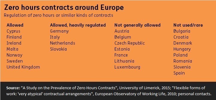 Μία σχετική έρευνα του βρετανικού Εργατικού Κόμματος, το 2016, ανέφερε ότι επτά ευρωπαϊκές χώρες επιτρέπουν τα zero hours contracts, τέσσερις χώρες τα επιτρέπουν με αυστηρούς κανόνες, ενώ σε πολλές χώρες είτε δεν ισχύουν είτε δεν χρησιμοποιούνται.