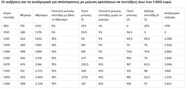 Στις περιπτώσεις που διαπιστώνεται ότι οι κύριες συντάξεις εξακολουθούν να είναι στην ίδια κλίμακα περικοπών, π.χ. πάνω από 1.000 ευρώ ή πάνω από 1.500 ευρώ ή πάνω από τα 2.000 ευρώ, χωρίς να υπολογίζεται το μέρισμα, οι κρατήσεις μένουν ίδιες και οι απόστρατοι παίρνουν τα ίδια ποσά.