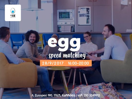 Στις 28 Σεπτεμβρίου – από τις 4 το μεσημέρι έως και τις 8 το βράδυ- το πρόγραμμα egg μέσω της εκδήλωσης “egg speed matching” δίνει την ευκαιρία σε νέους επιστήμονες και επαγγελματίες να γνωρίσουν face to face τους StartUppers του egg και να διερευνήσουν την πιθανότητα μιας συνεργασίας μαζί τους.