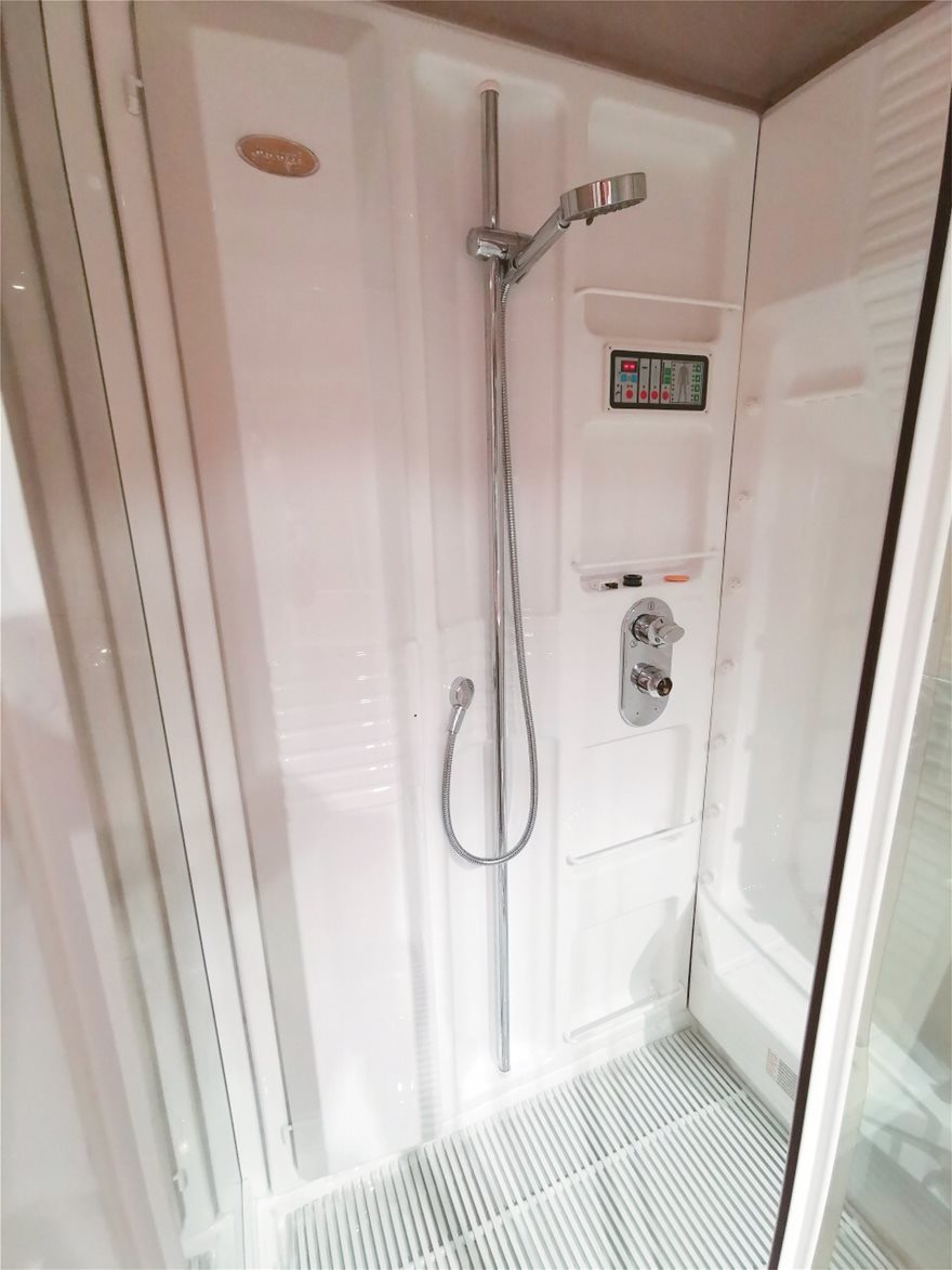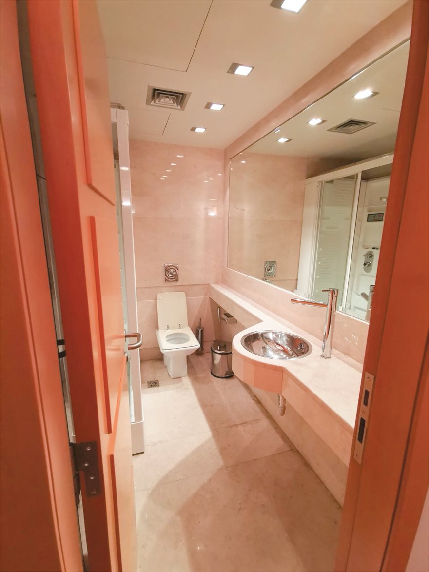 Το πολυτελές μπάνιο ξενοδοχειακών προδιαγραφών στο γραφείο του Μανούσου Μανουσάκη διαθέτει ξεχωριστή καμπίνα ντουζιέρας-υδρομασάζ