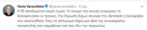 «Η ΕΕ αποδομείται καιρό τώρα. Το όνειρο της κοινής ευημερίας το δολοφόνησαν οι τρόικες. Την Ευρώπη δίχως σύνορα την εξετέλεσε η ξενοφοβία που ακολούθησε. Χτες το απόγευμα πήρα μια ιδέα της ανεγκέφαλης καταστολής που καραδοκεί εκεί που δεν την περιμένεις» έγραψε στον λογαριασμό του στο twitter, ο Γραμματέας του ΜέΡΑ25, μετά τη δημοσιοποίηση του επεισοδίου.
