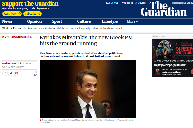 «Ευνοιοκρατία, νεποτισμός, πολιτική προστασία και σπατάλες έχουν κατηγορηθεί για την αμείλικτη διολίσθηση της χώρας προς την οικονομική κατάρρευση. Με επίγνωση του ρόλου του κόμματός του στο δράμα- η ΝΔ και το ΠΑΣΟΚ εναλλάσσονταν στην εξουσία για δεκαετίες- μία από τις πρώτες ενέργειες του Μητσοτάκη αυτή την εβδομάδα ήταν να απαγορεύσει τον διορισμό συγγενών από κυβερνητικούς αξιωματούχους. Ενας κανόνας, που είπε, θα είναι ο πρώτος που θα τηρήσει πιστά», αναφέρει ο Guardian.