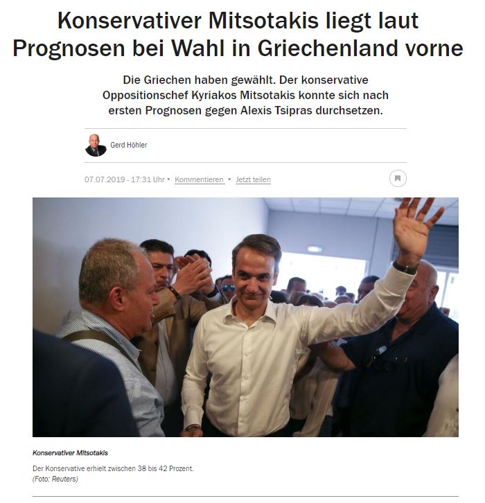 Αλλαγή δυνάμεων στην Ακρόπολη. Ο συντηρητικός υποψήφιος της αξιωματικής αντιπολίτευσης είναι ο νικητής των εθνικών εκλογών και θα είναι ο επόμενος πρωθυπουργός της Ελλάδας, γράφει η γερμανική εφημερίδα Handelsblatt.