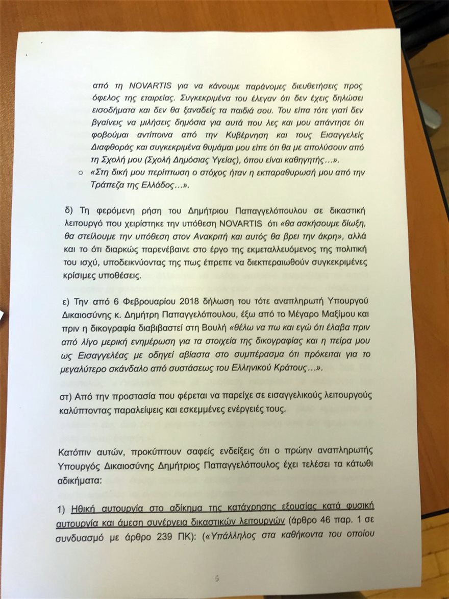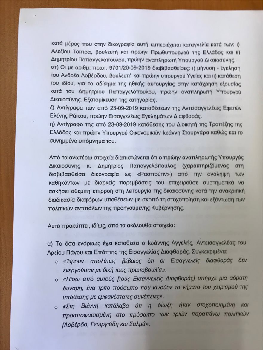 Το κείμενο που υπογράφεται από 30 βουλευτές της κυβερνητικής παράταξης στηρίζεται κυρίως στις καταθέσεις του αντιεισαγγελέα του Αρείου Πάγου Ιωάννη Αγγελή και της πρώην επικεφαλής της εισαγγελίας Εγκλημάτων Διαφθοράς Ελένης Τουλουπάκη που περιγράφουν τον παραθεσμικό μηχανισμό του Ρασπούτιν και καταλήγει στο ότι ο πρώην αναπληρωτής υπουργός Δικαιοσύνης πρέπει να ελεγχθεί για την τέλεση των εξής αδικημάτων: