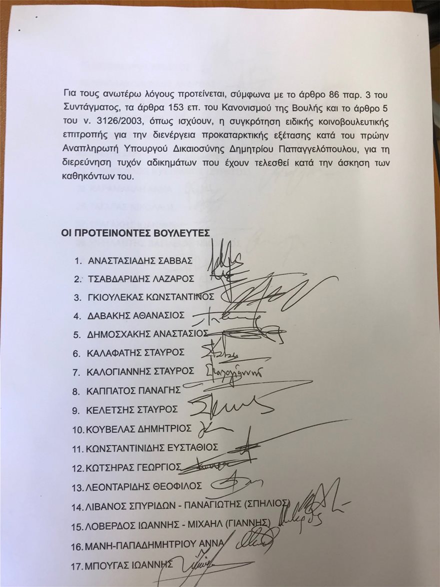 Για τέσσερα αδικήματα παραπέμπεται ο κ. Δημήτρης Παπαγγελόπουλος στην προανακριτική επιτροπή σύμφωνα με την πρόταση που κατέθεσε στην Βουλή η Νέα Δημοκρατία.