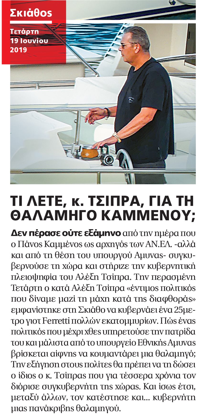 Την ώρα που ο Αλέξης Τσίπρας υποτίθεται ότι δίνει τη «μάχη για τους πολλούς» και εναντίον της «Ελλάδας των ελίτ» ο μέχρι πρότινος συνέταιρός του στην εξουσία δεν έχει κανένα πρόβλημα να κάνει παρέλαση στο Αιγαίο και τις Σποράδες, επιδεικνύοντας χωρίς κανένα πρόβλημα μια υπερπολυτελή θαλαμηγό που αναμφίβολα συγκαταλέγεται στην ελίτ της σκαφάτης χλιδής.