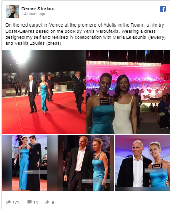 Φωτογραφίες από την πρεμιέρα του Φεστιβάλ Βενετίας όπου συμμετέχει η ταινία του Κώστα Γραβρά «Ενήλικοι στο Δωμάτιο» η οποία βασίζεται στο βιβλίο του Γιάνη Βαρουφάκη δημοσίευσε στο Facebook η σύζυγος του πρώην ΥΠΟΙΚ Δανάη Στράτου.