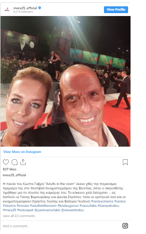 Ο πρώην υπουργός Οικονομικών επιστράτευσε, μάλιστα, και το κόμμα του, το ΜεΡΑ25 προκειμένου να προωθήσει την ταινία επισημαίνοντας ότι «το κόκκινο χαλί διέσχισαν … εις διπλούν οι Γιάνης Βαρουφάκης και Δανάη Στράτου: τόσο οι ορίτζιναλ όσο και οι κινηματογραφικοί (Χρήστος Λούλης και Βαλέρια Γκολίνο)».