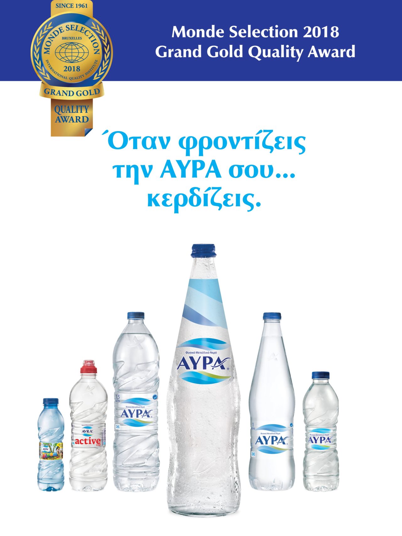 Η νέα διάκριση του Φυσικού Μεταλλικού Νερού ΑΥΡΑ αποδεικνύει την εξαιρετική του ποιότητα και γεύση και επιβεβαιώνει την προσήλωση της Coca-Cola Τρία Έψιλον στην άριστη ποιότητα και ασφάλεια των προϊόντων της. Γιατί όταν φροντίζεις την ΑΥΡΑ σου, κερδίζεις!