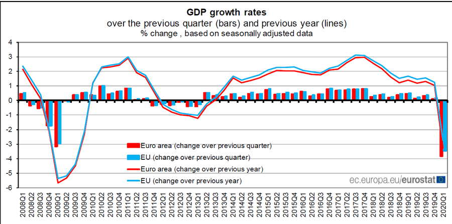 Η ανακοίνωση για την Ευρωζώνη ακολούθησε τις ανακοινώσεις της Γαλλίας και της Ισπανίας σήμερα για το ΑΕΠ του πρώτου τριμήνου: Με πτώση -5,8% και -5,2% αντίστοιχα, αποτελούν πρωτοφανείς αρνητικές επιδόσεις.
