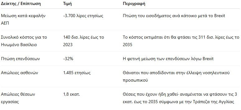 «Δεν υπάρχει νόημα στο να κλαίει κανείς πάνω από το χυμένο γάλα», λέει μια αγγλική παροιμία. Στην περίπτωση της Μεγάλης Βρετανίας, ωστόσο, καθώς πρέπει να βρεθεί ποιος… έχυσε την καρδάρα με το γάλα, η ανάλυση των μυρίων κακών που έφερε στη χώρα το Brexit αποτελεί, για πολλούς, ένα σοβαρό πάθημα και μάθημα. Γιατί το μέλλον δεν προδιαγράφεται ιδιαίτερα λαμπρό, με το οικονομικό επιτελείο της βρετανικής κυβέρνησης να προβλέπει ότι το Brexit θα κοστίσει 3 εκατομμύρια θέσεις εργασίας ως το 2035. Και καθώς οι συνέπειες του Brexit σε μια σειρά από τομείς συνεχίζονται, από το brain drain και τη δυσκολία στο εμπόριο ως την «απομόνωση» του βρετανικού ιατρικού προσωπικού από τον ευρωπαϊκό επιστημονικό κόσμο που έχει ως αποτέλεσμα την κατάρρευση του NHS, η χώρα θα πρέπει να ετοιμάζεται για νέα σκληρά χτυπήματα, προειδοποιούν οι έρευνες.