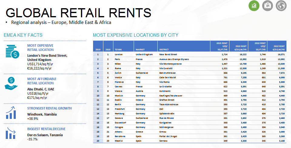 Τα στοιχεία προέρχονται από την τελευταία μελέτη της γνωστής εταιρείας συμβούλων ακινήτων Cushman & Wakefield για τους βασικότερους εμπορικούς δρόμους στις μεγαλουπόλεις του κόσμου (Main Streets Across the World 2019).
