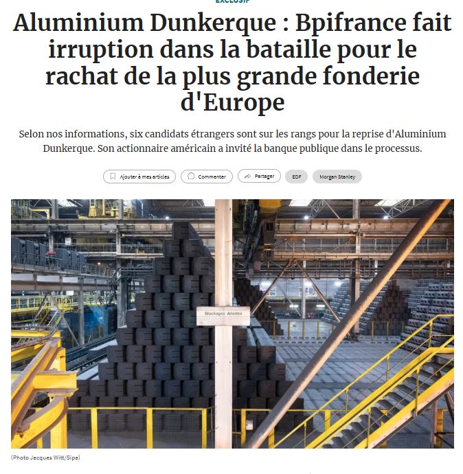 Οι 750 εργαζόμενοι της Aluminium Dunkerque ζητούν ήδη ανοιχτά την παρέμβαση του γαλλικού κράτους. Το αίτημα, που αποκτά μεγαλύτερη πολιτική βαρύτητα ενόψει των δημοτικών εκλογών, φαίνεται πως εισακούστηκε. Σύμφωνα με συγκλίνουσες πληροφορίες, η Bpifrance έχει κληθεί από την Aluminium Dunkerque και τον βασικό της μέτοχο, το αμερικανικό επενδυτικό κεφάλαιο AIP, να διενεργήσει ελέγχους due diligence, με στόχο την πιθανή στήριξη ενός ή περισσότερων υποψηφίων επενδυτών.