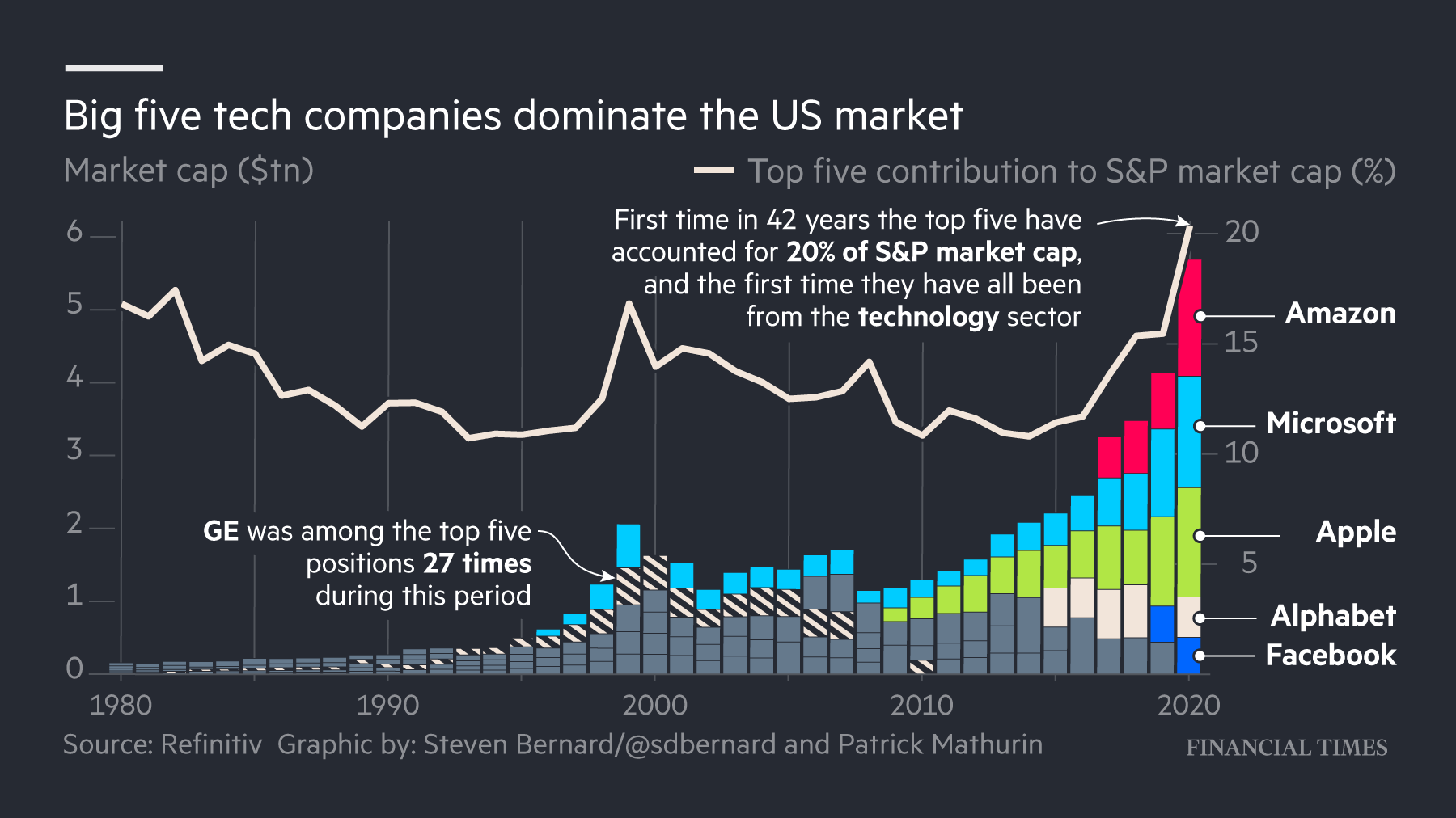 Αυτό σημαίνει ότι η στάθμιση (το ποσοστό επί της συνολικής κεφαλαιοποίησης) στον δείκτη υψηλής κεφαλαιοποίησης της Wall Street S&P 500 -τον δείκτη βαρόμετρο για το παγκόσμιο επιχειρείν- έχει ανέλθει στο 25%, από το σχεδόν 20% πριν το ξέσπασμα της πανδημίας.