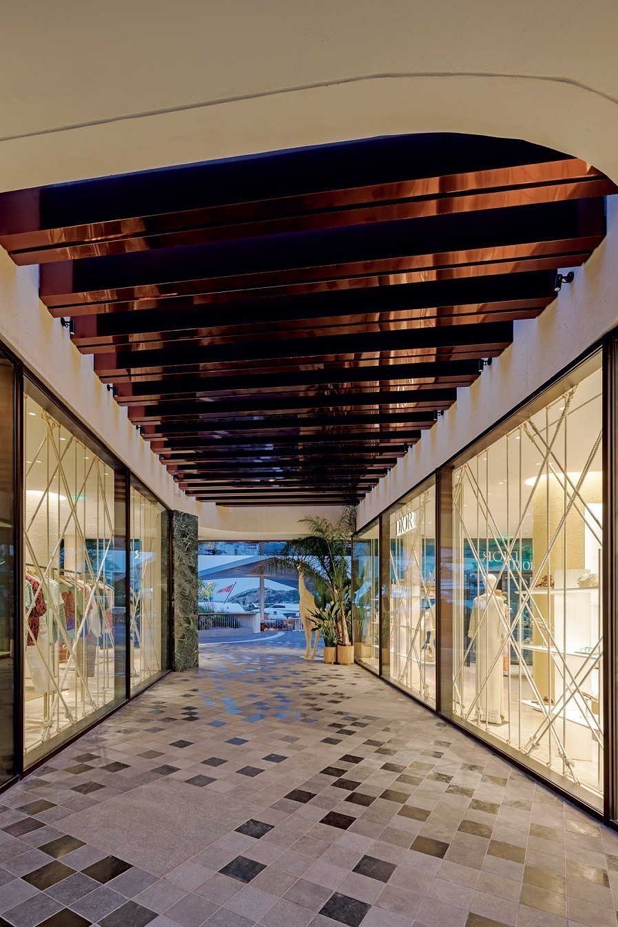 Η πολυτέλεια και η λάμψη των υλικών των yachts επηρέασαν την αισθητική των υλικών που επιλέχθηκαν, όπως τα εντυπωσιακά στιλπνά στέγαστρα από ειδικής επεξεργασίας κόκκινο ανοξείδωτο χάλυβα που πλαισιώνουν τα καταστήματα και τις μαρμάρινες παραστάδες από πράσινο μάρμαρο Τήνου που τα διαχωρίζουν.