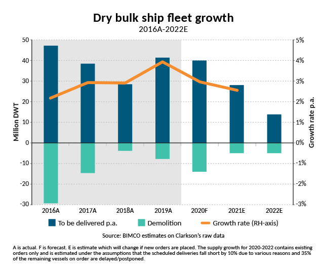 Η BIMCO προβλέπει επίσης αύξηση 3% του στόλου ξηρού χύδην φορτίου το 2020, αναμένοντας επιπλέον 39,3 εκατ. τόνους μεταφορικής ικανότητας να προστεθούν στον παγκόσμιο στόλο μέχρι το τέλος του έτους.