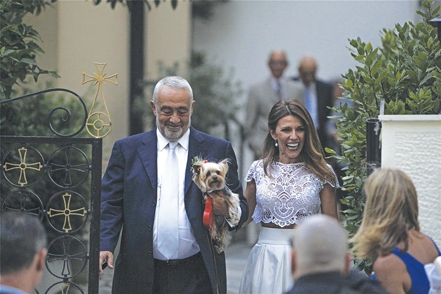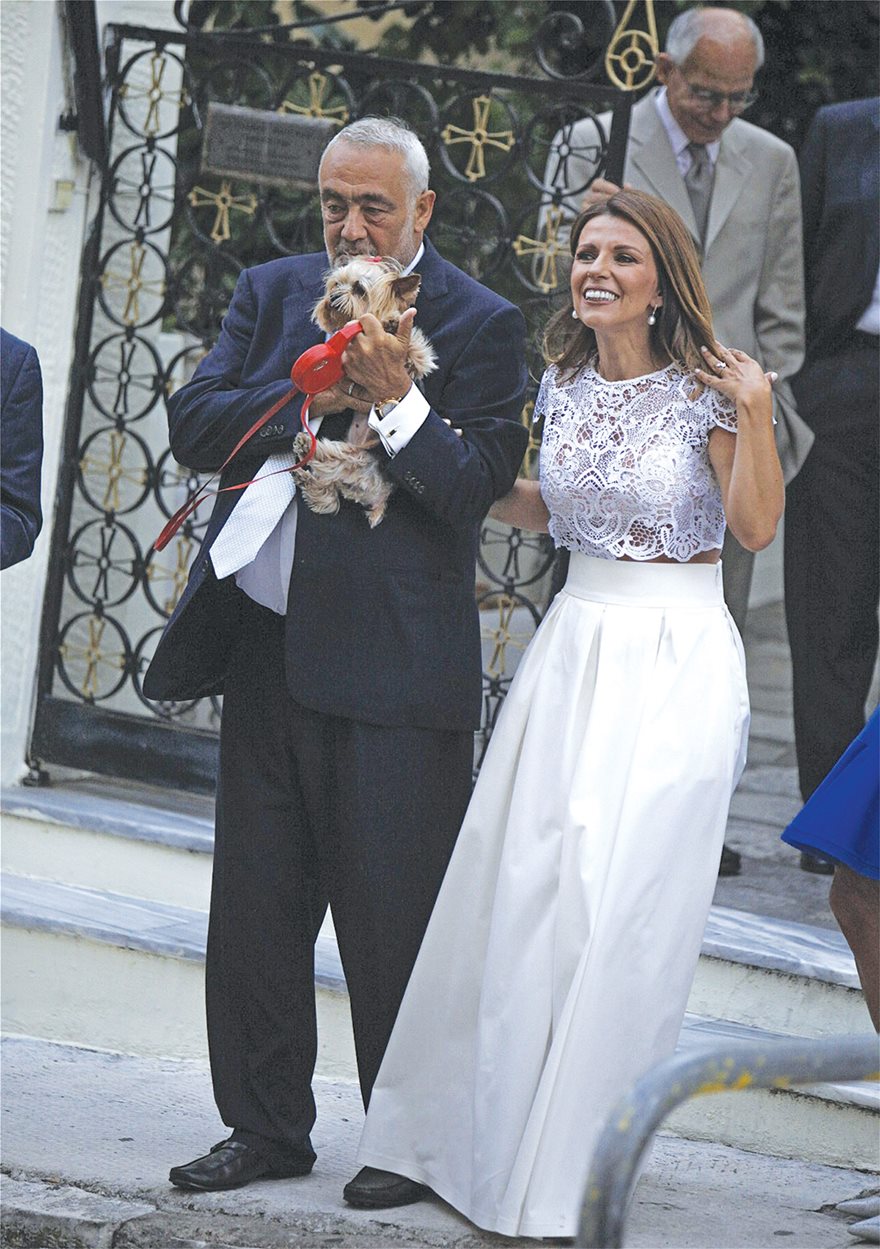 O Μιχάλης Γουλανδρής και η Νένα Παρασκευοπούλου βγαίνουν από το εκκλησάκι όπου τελέστηκε ο γάμος τους τον Ιούλιο του 2017. Πριν και μετά το μυστήριο ο εφοπλιστής δεν άφησε ούτε στιγμή από την αγκαλιά του το αγαπημένο του σκυλάκι