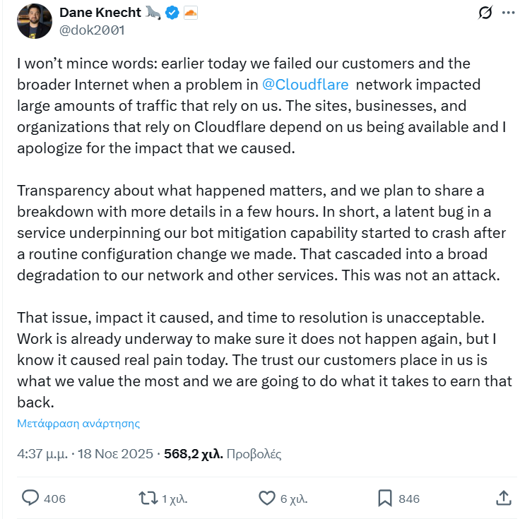 «Η διαφάνεια σχετικά με το τι συνέβη έχει σημασία και σχεδιάζουμε να μοιραστούμε μια ανάλυση με περισσότερες λεπτομέρειες σε λίγες ώρες. Εν ολίγοις, ένα λανθάνον σφάλμα σε μια υπηρεσία που υποστηρίζει την ικανότητα μετριασμού των bot άρχισε να καταρρέει μετά από μια συνηθισμένη αλλαγή διαμόρφωσης που κάναμε. Αυτό οδήγησε σε ευρεία υποβάθμιση του δικτύου μας και άλλων υπηρεσιών. Δεν επρόκειτο για κυβερνοεπίθεση» πρόσθεσε.