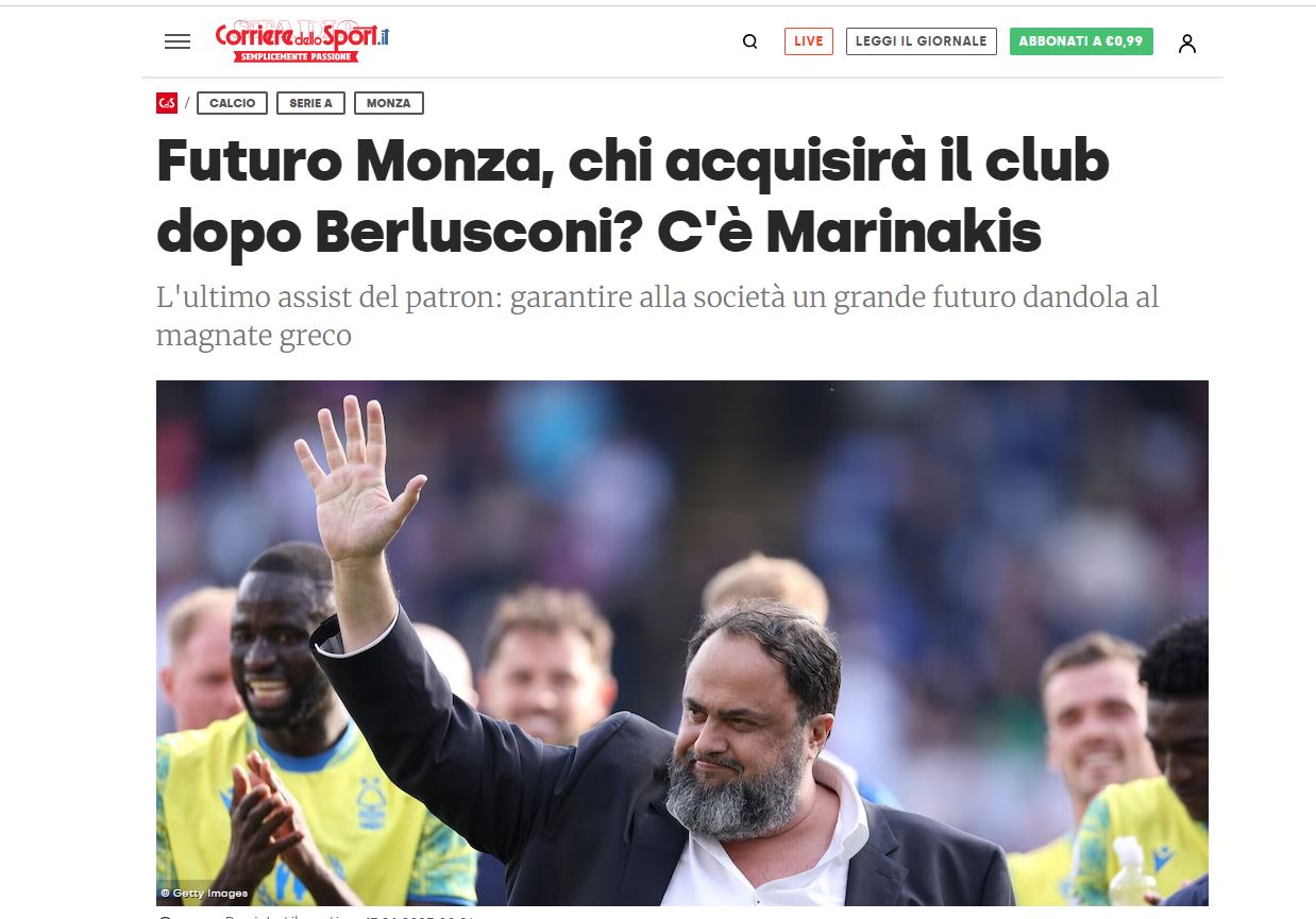 H ιταλική αθλητική εφημερίδα Corriere dello Sport, γράφει σήμερα ότι η ομάδα ποδοσφαίρου της Μόντζα, ιδιοκτησίας του Σίλβιο Μπερλουσκόνι, σύμφωνα με πληροφορίες, τις περασμένες ημέρες φέρεται να αγοράστηκε από τον Βαγγέλη Μαρινάκη. «Η διαπραγμάτευση διήρκεσε μερικές εβδομάδες και φέρεται να ολοκληρώθηκε πριν λίγες ημέρες», αναφέρει η εφημερίδα.
