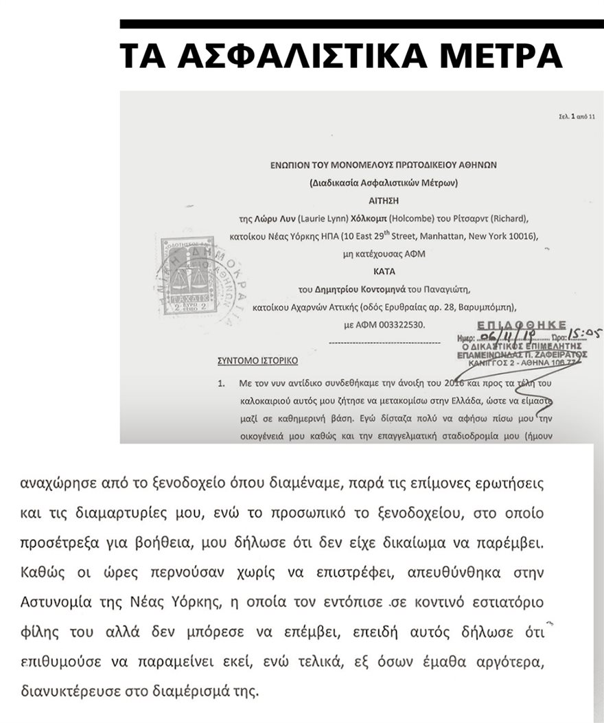Εκτιμάται πως ο Δημήτρης Κοντομηνάς θεώρησε την εμπλοκή της Αστυνομίας, μετά από κλήση της Λόρι Χόλκομπ, προσωπική προσβολή. Βαθιά θιγμένος, διανυκτερεύει εκείνο το βράδυ στην κατοικία της Ελληνίδας φίλης του και επιστρέφει τελικά μόνος στην Ελλάδα στις 21 Σεπτεμβρίου. Πριν ανέβει στο αεροπλάνο ακυρώνει τα εισιτήρια της πρώην -για τον ίδιο πλέον- συντρόφου του και της παθολόγου του. Ωστόσο, μετά από επικοινωνία της τελευταίας με το γραφείο του επιχειρηματία στην Αθήνα, η ακύρωση ανακαλείται. «Οσο για μένα», σύμφωνα με όσα αναγράφονται στην αίτηση ασφαλιστικών μέτρων που κατέθεσε η κυρία Χόλκομπ, με την έκδοση προσωρινής διαταγής που ζήτησε να απορρίπτεται, «έμαθα ότι ο νυν αντίδικος χρησιμοποίησε τη σχετική κράτηση του εισιτηρίου μου για να επιστρέψει μαζί του στην Ελλάδα η εν λόγω φίλη του, αφήνοντάς με σύξυλη στη Νέα Υόρκη, χωρίς καμία απολύτως δικαιολογία ή προειδοποίηση».
