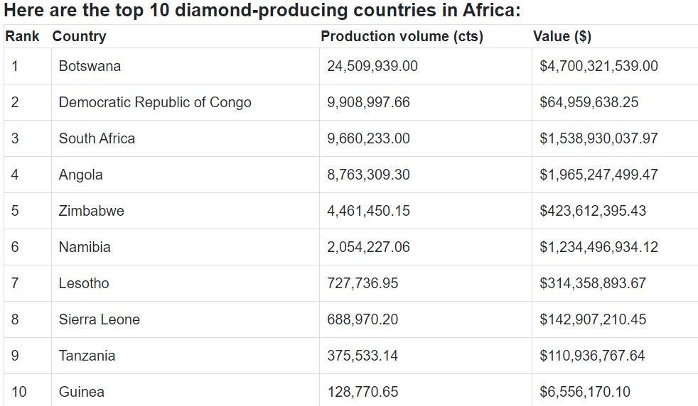 Σε επίπεδο Αφρικής αυτές είναι οι 10 κορυφαίες χώρες παραγωγής διαμαντιών: