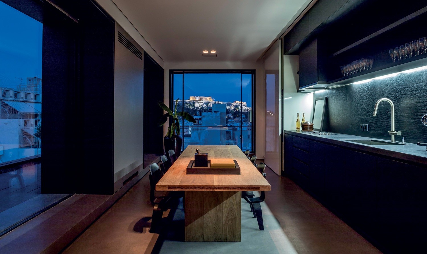 Ο,τι βρίσκεται στη συγκεκριμένη κατοικία είναι απόλυτα εναρμονισμένο με τη φιλοσοφία του χώρου. Οπως τα custom έπιπλα της Zege, η χαμηλή τραπεζαρία και το ασυνήθιστο κρεβάτι, που έχουν σχεδιαστεί έτσι ώστε να διατηρούν ανεμπόδιστη τη θέα προς την Ακρόπολη. Το interior design υιοθετεί τη λογική ενός γνήσιου loft με διαχρονικό και clean-cut χαρακτήρα, όπου το φως, τα υλικά και τα αντικείμενα λειτουργούν ως χρηστικά γλυπτά. Ολα μαζί συνθέτουν έναν ενιαίο, ήρεμο και ατμοσφαιρικό χώρο, μια όαση γαλήνης κι ας έχει φόντο το φασαριόζικο κέντρο.