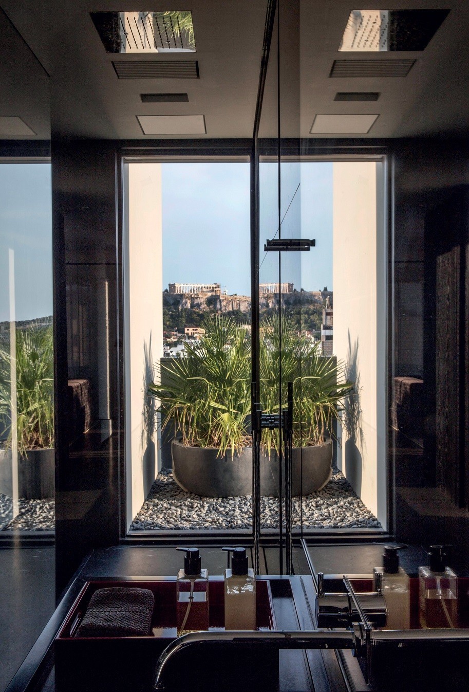 Τα μεταλλικά πλαίσια των ανοιγμάτων εντείνουν την αίσθηση του κάδρου προς τη θέα, ενώ η χρωματική συνέχεια μεταξύ εσωτερικού και εξωτερικού χώρου ενισχύει τη σύνδεση με το αστικό τοπίο.