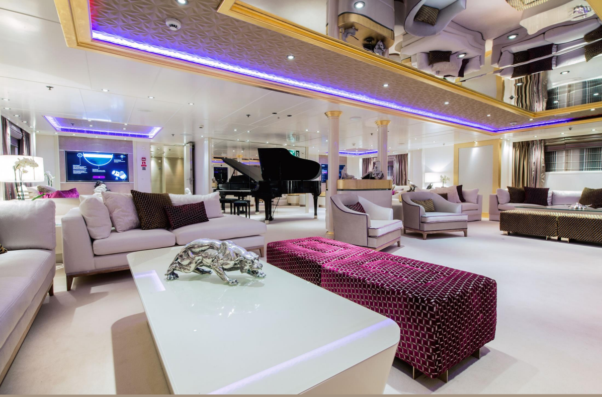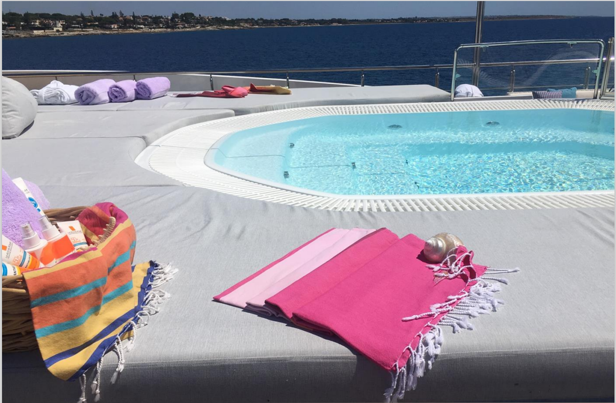 Ένα κατάστρωμα ηλιοθεραπείας 260 τετραγωνικών μέτρων περιλαμβάνει όλα όσα χρειάζονται για υπαίθρια ψυχαγωγία και χαλάρωση, όπως μαξιλάρια ηλιοθεραπείας, τζακούζι 12 ατόμων και μπαρ. Το πολυτελές σκάφος διαθέτει ακόμη κινηματογράφο,spa, αίθουσα μασάζ, καθώς και ανελκυστήρα που διατρέχει όλα τα καταστρώματα.