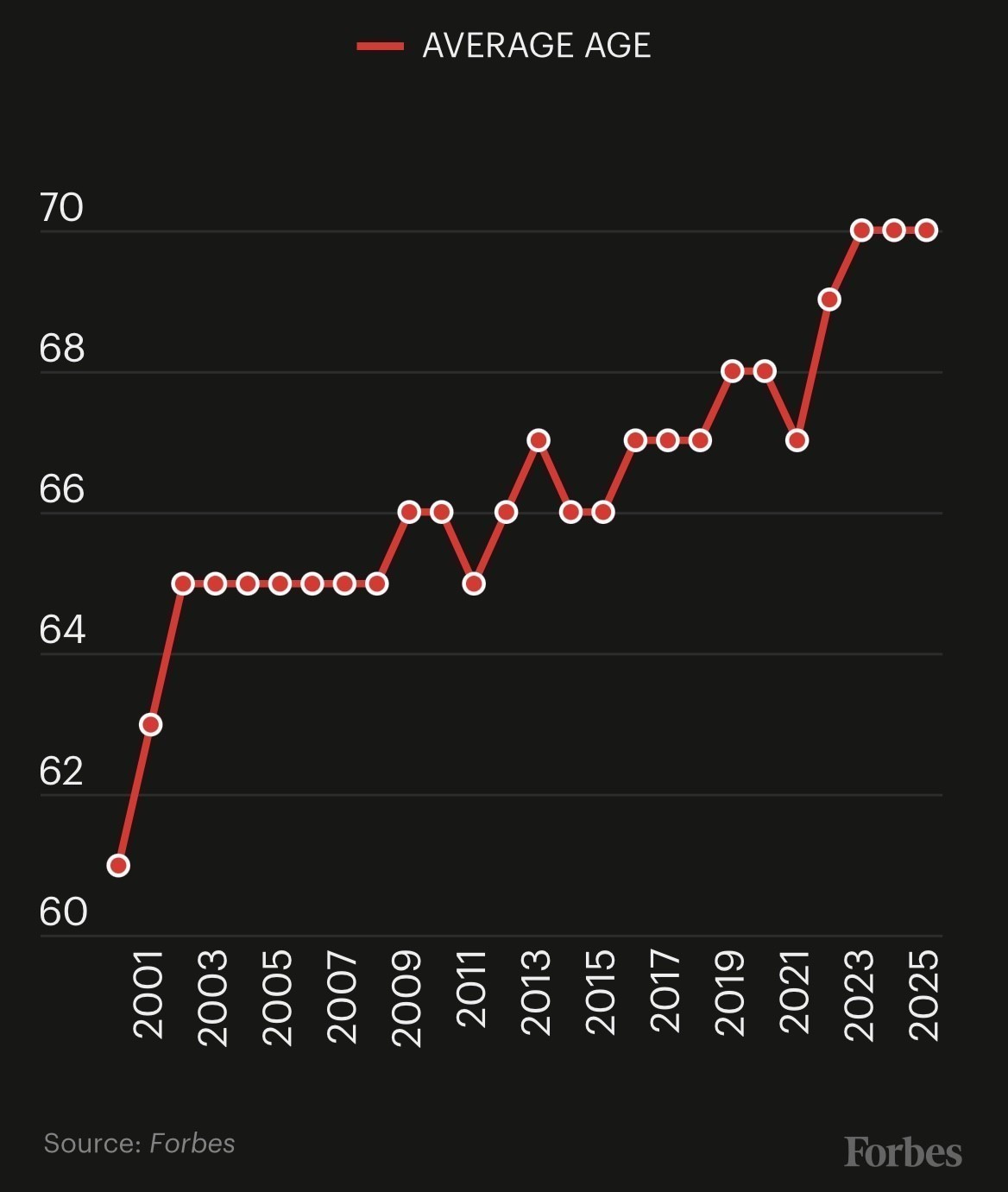 Ακολουθεί γράφημα με τον μέσο όρο ηλικίας των δισεκατομμυριούχων της λίστας Forbes 400 (2001 – 2025):