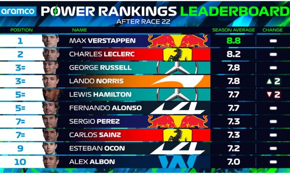 Σύμφωνα με την F1 δεν υπολογίζεται η δυναμική των μονοθέσιων στην αξιολόγηση των οδηγών. Έτσι, ο Max Verstappen αναδείχθηκε ως ο κορυφαίος οδηγός της χρονιάς για δεύτερη φορά στην καριέρα του. Η πρώτη ήταν το 2020. Η μέση βαθμολογία του ήταν στο 8,8. Ο Verstappen είχε βαθμολογηθεί με το απόλυτο 10 σε Imola, Spa και Suzuka φέτος.