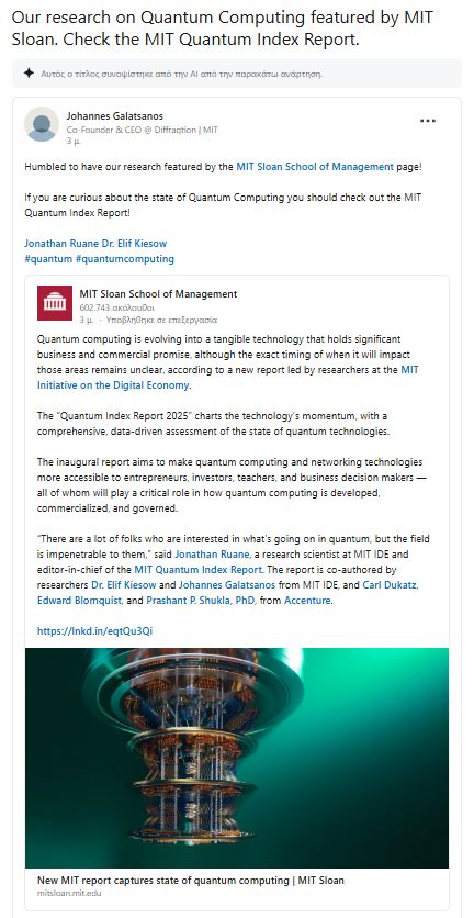 «Μεγαλώνοντας ως παιδί που παρατηρούσε τα αστέρια σε μια αγροτική ελληνική νησιωτική πόλη, δεν θα φανταζόμουν ποτέ ότι θα κέρδιζα ένα βραβείο για την Διαστημική Καινοτομία της Χρονιάς στις ΗΠΑ!» έγραψε ο Γιάννης πριν από δύο μήνες, όταν η Diffraqtion κέρδισε την 1η θέση στο Space Innovation Challenge στη Διάσκεψη Κορυφής & Έκθεσης Διαστημικής Βιομηχανίας & Κυβέρνησης 2025 των ΗΠΑ.