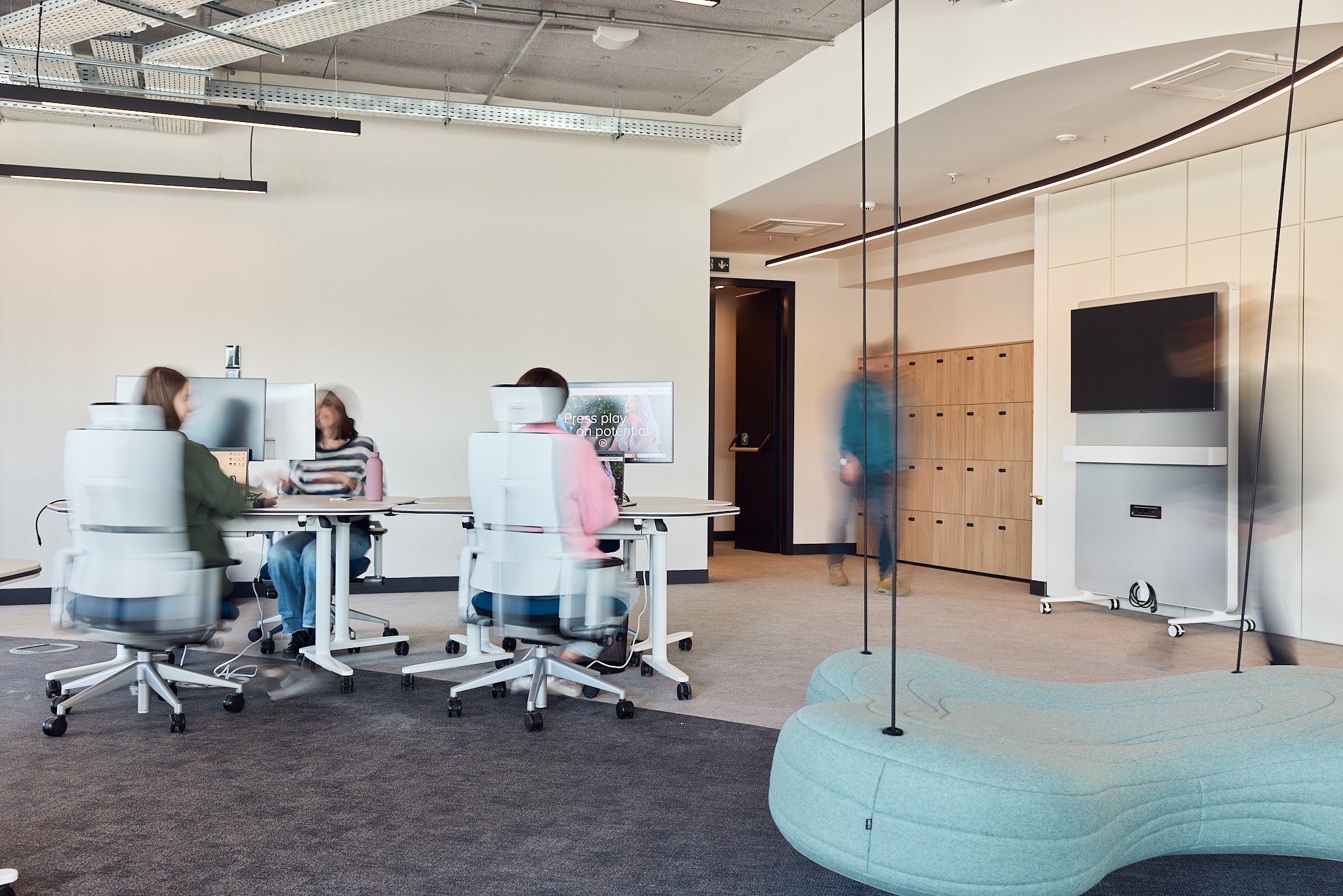 -Διαθέτει γραφειακό εξοπλισμό υψηλής ποιότητας, συμπεριλαμβανομένων γραφείων που μετακινούνται εύκολα στο χώρο και ενώνονται σε διάφορους σχηματισμούς προκειμένου να εξυπηρετήσουν τις ανάγκες ομάδων εργασίας, ειδικά της πολυάριθμης ομάδας τεχνολογίας.