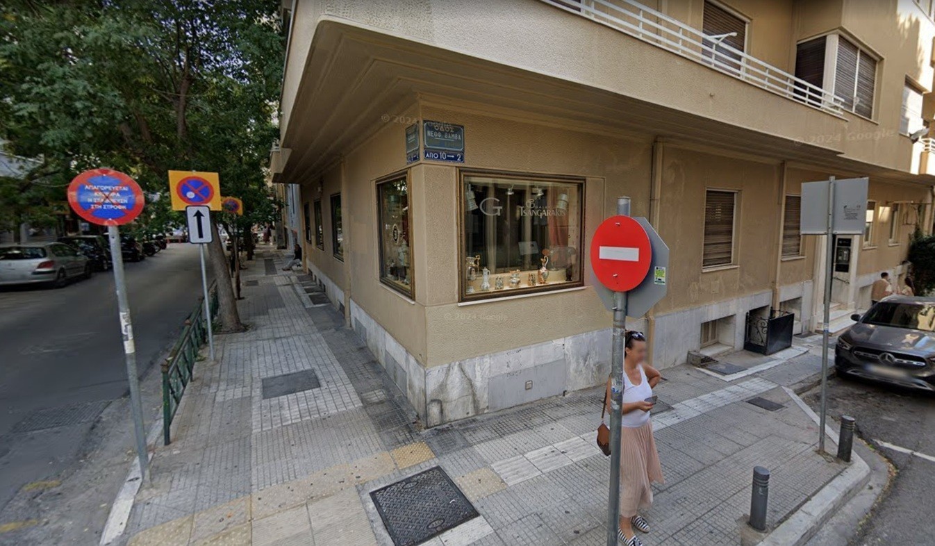 Το κατάστημα της «Galerie Tsangarakis» στο Κολωνάκι, βρίσκεται σε ιδιαίτερα προβεβλημένο σημείο στη γωνία των οδών Νεοφύτου Βάμβα και Καψάλη.