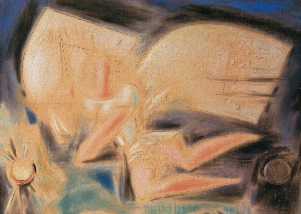 Η μνημειώδης ελαιογραφία, που ζωγραφίστηκε περίπου το 1950, μέσα από έναν συνδυασμό συμβολισμού, πνευματικότητας και αφαίρεσης εκφράζει τα υψηλά ιδεώδη της πίστης, της αρμονίας και της υπεροχής με μία σχεδόν απόκοσμη ατμόσφαιρα. Στο έργο ανακαλούνται δύο κόσμοι, ένας επίγειος και ένας υπερβατικός, με τον ‘Αγγελο να εμφανίζεται ως μεσολαβητής και κομιστής της έμπνευσης κατά το πρότυπο της αρχαίας μούσας.