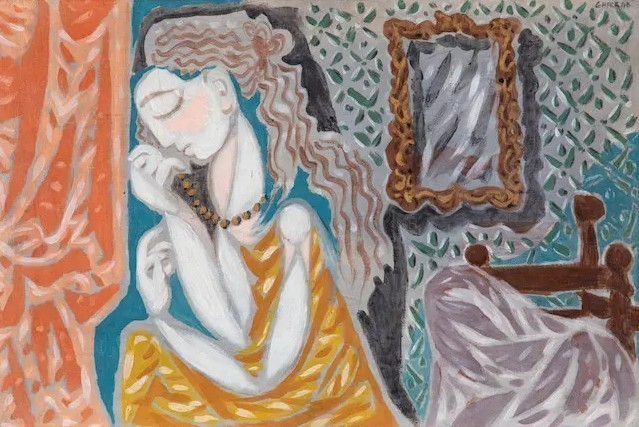 ‘Αλλο εξίσου σημαντικό έργο είναι το «Γυναίκα σε Εσωτερικό Χώρο με Καθρέπτη» (40.000-60.000 ευρώ) του 1940. Η ελαιογραφία αντανακλά την δεξιοτεχνία του ζωγράφου να απορροφά την ατμόσφαιρα της προπολεμικής περιόδου της παρισινής καλλιτεχνικής σκηνής με έντονη την επιρροή των έργων του Πάμπλο Πικάσο της δεκαετίας του 1930. Η σύνθεση με την νέα γυναίκα με κλειστά τα μάτια πιθανότατα είναι εμπνευσμένη από του έργο του Πικάσο, «Le Reve» της συλλογής Ganz.